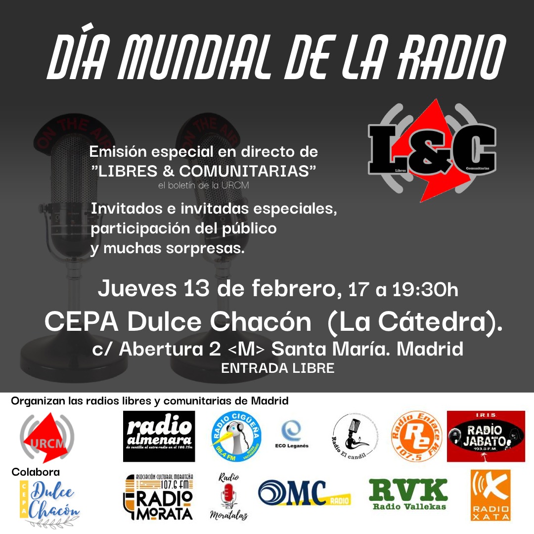 Especial de Radio Moratalaz. Con motivo de la celebración del Día Mundial de la Radio, hemos preparado un programa especial realizado por varios de nuestros programas actualmente en emisión: Tetas libres, Una ración de actualidad, Moratalaz en la radio, Voces en la radio y Puré de payasos. Como artista invitado, Chuso, uno de los fundadores de Radio Moratalaz.